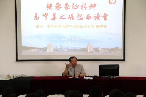为进一步推动“与信仰对话”主题活动的深入开展和品牌深化,引导和帮助广大团干部和青年学生树立和践行社会主义核心价值观,坚定为实现中国梦而奋斗的理想信念,5月22日下午,永利yl23411集团官网“与信仰对话·飞young中国梦”精品报告会在图书馆报告厅举行。国家一级书法家、毛体书法家、中华国礼书画家梅楚安老师担任主讲嘉宾。副校长吴桃娥接见了梅老师,永利yl23411集团官网近200名学生代表聆听了报告。报告会由校团委书记闫来英主持。