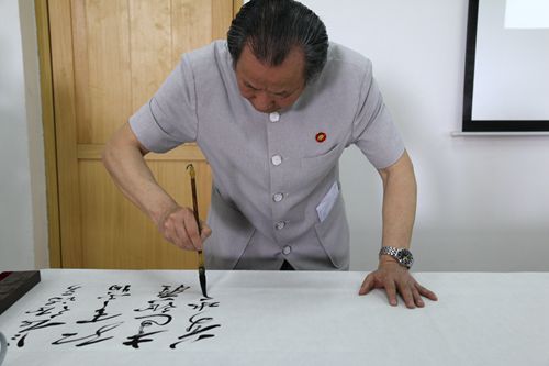 校团委书记闫来英主持时用了一个短片来介绍梅老师和他的艺术人生。梅老师在这个时间在现场书写毛主席诗词《七律 长征》。梅老师在写完之后受到全场观众的热烈掌声,梅老师写的《七律 长征》潇洒流畅、飘逸俊美、如行云流水。