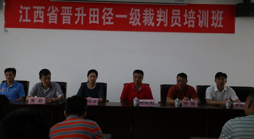 6月11日上午8:30,在八里湖校区综合楼621室召开了江西省晋升国家田径一级裁判员培训班开班仪式,仪式由江西省体育局田游中心付锋副主任主持,出席仪式的领导有国家体育总局训练局杨培刚副局长、江西省体育局青少处周凌云处长、江西省田游管理中心竞训科金丽琴科长、九江学院体育学院王勤院长、党委书记张浦强和九江中体公司万建国总经理;参加仪式的还有田径教研室所有教师、其他教研室部分教师和110多名学生学员。