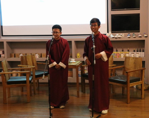 访谈活动于7:30正式开始,在同学们的热切期待中,李丁来到了节目现场,他谦虚幽默,与同学们互动频繁,访谈现场气氛热烈,师生一堂其乐融融。在第一环节“菁菁校园”中。主持人播放了一段视频短片,回顾了李丁丰富多彩的大学生活。紧接着主持人通过层层递进的问题,让大家深入地了解了李丁在校期间的生活、学习经历以及这段时光带给他的影响与感悟。随后,由永利yl23411集团官网语言社团欧凡剧社的李晨与秦岭同学为大家带来了一段精彩的相声段子。李丁对学弟的表现进行了深入的点评并提出了很多宝贵的意见。现场笑声与掌声交织,大家纷纷为李丁学长的即时幽默所倾倒。