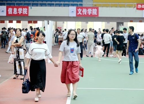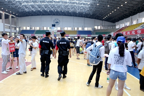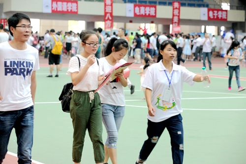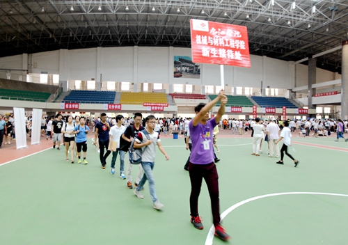 不仅田径馆门外热闹非凡,场馆内更是人声鼎沸。早已做好充分准备的校迎新现场各部门和各二级学院的老师与同学热情地接待了每一位经历了舟车劳顿的新生们。