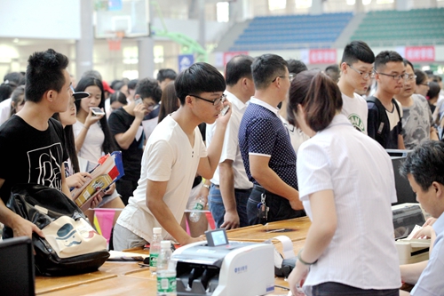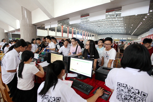 今年的新生报到注册流程更加简化和便捷,效率也明显提高。记者采访发现,偌大的室内田径馆报到大厅内没有拥挤的学生,有的只是井然有序和简洁明了。新生办理报到手续时,只需提交本人身份证和录取通知书即可。工作人员扫描读取录取通知书上的条形码,就可以获得学生的全部信息,哪个学院、哪个专业、年龄、生源地等内容一应俱全。这种全新的迎新系统将很多工作都做了前置处理。