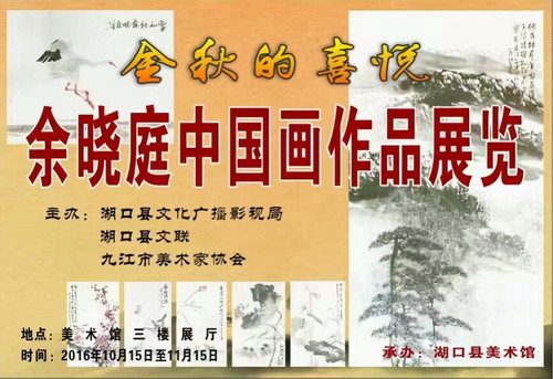 10月15日上午,艺术学院余晓庭老师“金秋的喜悦——余晓庭老师中国画作品展”在余晓庭老师的家乡湖口县美术馆隆重开幕。出席展览开幕仪式的领导有:市委常委、军分区政委汪开华,九江学院副校长杨焱林,九江学院艺术学院书记王春生,市委副秘书长齐美龙,原市长助理、老年书画协会会长杨振辉,湖口县委书记李小平,湖口县县长鲍成庚,九江县县长赵和平,省美协副主席帅安,市美协主席宋跃林,市文联主席陆建春,市书协主席吴小京,市美术馆馆长胡毅著名书画家徐东林、崔廷瑶、汤炎生等。
