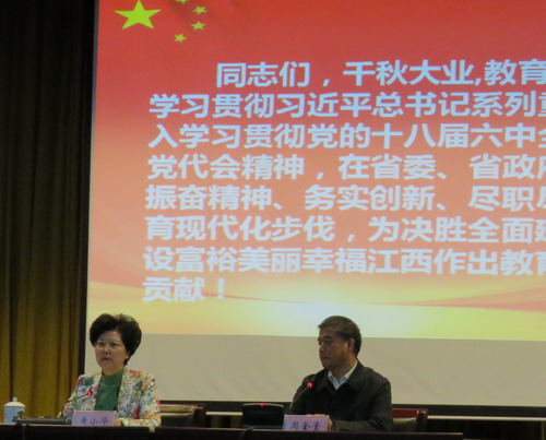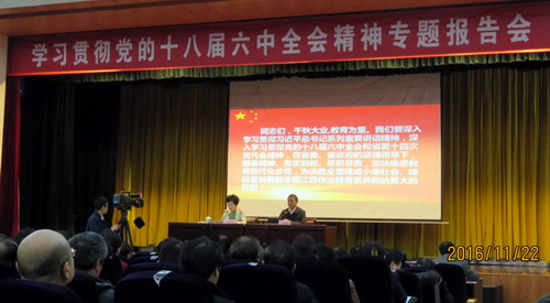 为认真学习贯彻党的十八届六中全会和省十四次党代会精神,大力推进“十三五”期间我省教育改革发展各项工作,11月22日,省委教育工委在南昌举行学习贯彻党的十八届六中全会和省第十四次党代会精神专题报告会。省委教育工委书记黄小华作“学习贯彻党的十八届六中全会和省第十四次党代会精神,坚持中国特色社会主义道路,办好人民满意教育”专题报告,省教育厅巡视员周金堂主持报告会。省属本科高校党委副书记、组织部长、宣传部长以及教工党支部书记代表,全省高校第39期处级干部培训班学员等共360余人聆听报告。永利yl23411集团官网党委委员、副校长杨耀防及组织人事部副部长兼统战部部长周敏、八里湖管理办公室书记邓燕、宣传部副部长陈晓松出席报告会。