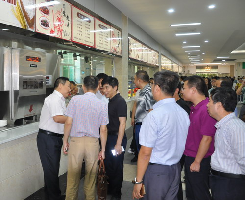 调研组一行在实地调研中,首先听取了夏副校长关于永利yl23411集团官网强化食品安全工作总体思路和做法,接着前往永利yl23411集团官网最大、就餐保障人数最多的学生三食堂实地调研。姜处长和蔡主任向调研组一行就永利yl23411集团官网食品安全机制体制保障、食品源头采购安全把控、ISO9001标准化操作、洁厨亮灶展示系统建设、自动售饭机等自动化信息化设备运行情况等多方面做了详细汇报。