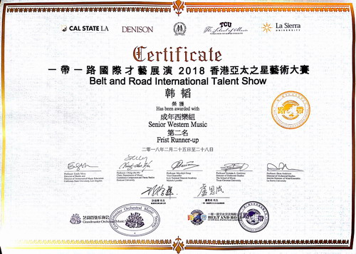 2月25日,首届一带一路国际才艺展演2018香港亚太之星艺术大赛在香港成功举办。本次比赛是由香港艺韵管弦乐协会、一带一路国际文化交流协会联合美国洛杉矶加利福尼亚州州立大学、美国丹尼森大学、美国德州基督教大学音乐学院、美国拉希瑞亚大学、乌克兰利先科国立音乐学院五所世界知名大学共同举办的大型艺术赛事。