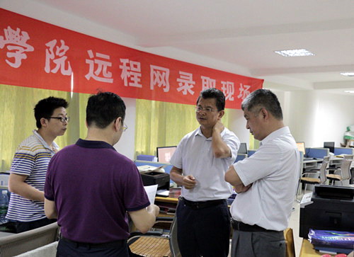 刘校长还与现场工作人员进行了交流,并来到电脑前仔细询问招生录取情况,鼓励大家要继续发扬吃苦耐劳的精神,持之以恒地做好招生工作,同时要求招就处要切实做好各项保障工作,为全体工作人员排忧解难。