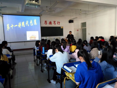 课堂上,洪老师用多媒体教学手段,结合大量的案例给大家讲了商品的包装和设计,生动具体,和学生互动频繁,王副校长聚精会神听取教师授课,认真做了课堂笔记。