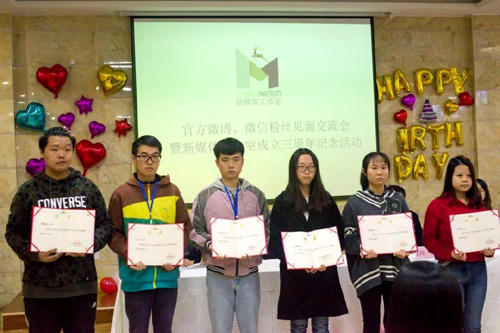 活动现场播放了新媒体工作室三周年纪念短片。新媒体工作室新任负责人吴诗岚同学汇报了工作室过去一年的工作并对新一年的工作进行展望。官方微博、微信编辑代表,部分二级学院新媒体工作者代表及粉丝代表分别做了交流发言。