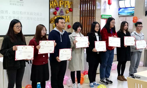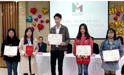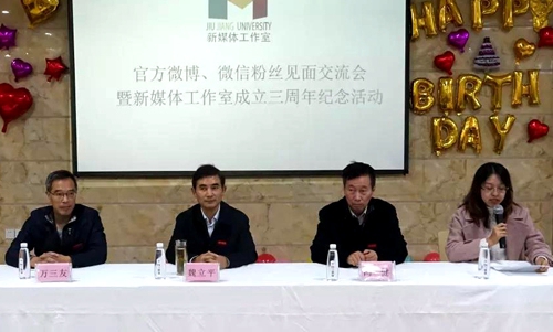11月11日下午,九江学院官方微博、微信粉丝见面交流会暨新媒体工作室成立三周年纪念活动在永利yl23411集团官网主校区教工食堂二楼成功举办,校党委副书记魏立平,校党委委员、党委宣传部部长冯健,党委宣传部副部长万三友出席活动。九江学院官方微博、微信粉丝代表及新媒体工作室全体同学参加了本次活动。本次活动由新媒体工作室指导老师高原主持。