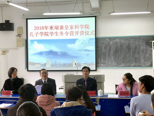 12月21日上午,由中国国家汉办主办,九江学院承办的“2018年柬埔寨皇家科学院孔子学院学生冬令营”活动开营仪式在国际交流学院会议室举行。杨耀防副校长出席开营仪式并讲话,来自柬埔寨的冬令营成员和永利yl23411集团官网柬埔寨孔子学院奖学金生等30余人参加了开营仪式。仪式由国际交流学院院长夏修龙主持。