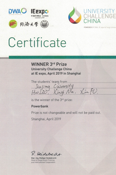 由德国水、污水和废弃物处理协会(DWA)、同济大学环境科学与工程学院和同济大学城市污染控制国家工程研究中心共同举办的第四届中国高校挑战赛于2019年4月17日在上海新国际博览中心举行。九江学院化学与环境工程学院刘辉、马昕怡和付欣三位同学在徐冰洁、黄亮和王天烽老师的指导下参加了该项比赛。来自同济大学、复旦大学、上海交通大学、华东师范大学、南京大学、武汉大学、重庆大学、东华大学、北京科技大学、上海电力大学、上海理工大学、湖北工业大学、九江学院及宜宾学院的共计14所高校的18支队伍参赛。