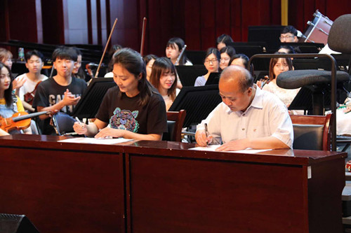 挂牌仪式前,徐戈主任一行看望了在永利yl23411集团官网排练的武音管弦系学生,并和艺术学院党委书记进行了合作协议的签订,仪式由艺术学院副院长欧阳时来主持。