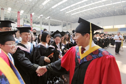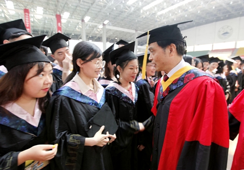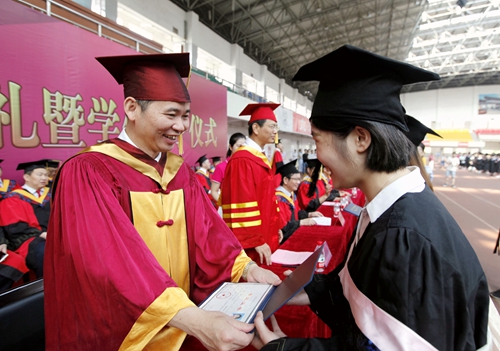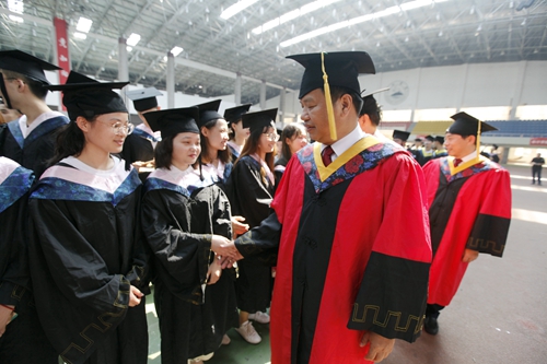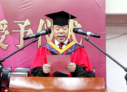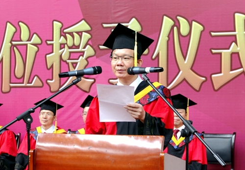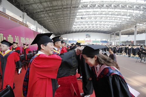 在学位授予仪式上,校党委书记赵伟、校长刘晓东为毕业生代表颁发毕业证书,全体校领导为毕业生代表拨正流苏,祝愿他们前程似锦、展翅高飞。