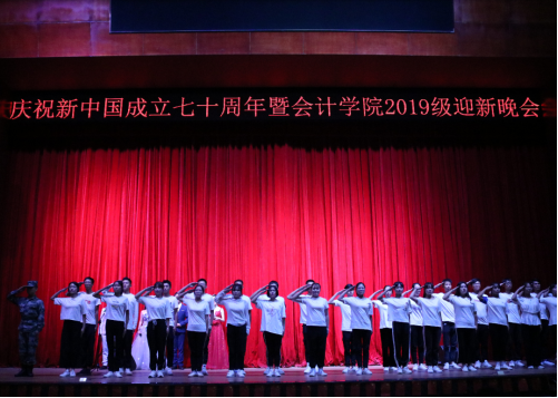 晚会正式开场,全体起立并齐唱《我和我的祖国》,大家一起挥动着手中的五星红旗,用嘹亮的歌声庆祝祖国母亲七十华诞。紧接着由吴铃发表了迎新晚会致辞。首先,吴铃对会计学院的全体教职工表示感谢,对在迎新及军训中辛勤付出的助导和学生骨干表示了衷心的祝愿,同时也为祖国七十周年生日送上了诚挚的祝福。最后,吴铃希望大一新生能够勤奋刻苦、努力成才将来更好的实现人生理想,努力成为中国特色社会主义事业的合格建设者和可靠接班人。