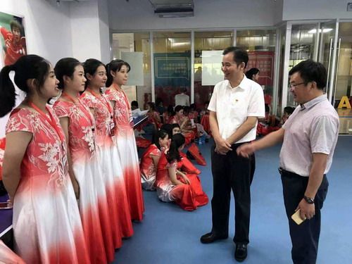 9月27日上午,校党委书记赵伟轻车简从,专程赴南昌来到“可爱的中国”——江西省庆祝中华人民共和国成立70周年群众歌咏晚会演出排练现场,看望慰问参加本次演出的永利yl23411集团官网艺术学院合唱团师生。