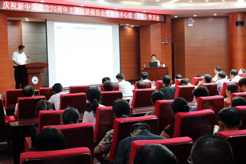 9月16下午,学校在逸夫图书馆学术报告厅举行庆祝新中国成立70周年主题宣讲报告会暨党委中心组(扩大)学习会,在家校领导赵伟、刘晓东、魏立平、纪岗昌、王万山、陈春生、杨耀防、夏启国、李广欣,校党委委员王殿元出席学习会,上海财经大学马克思主义学院院长章忠民教授受邀作《共和国70年华章巨变——从站起来、富起来到强起来的飞跃与逻辑步伐》专题辅导报告。校党委书记赵伟主持学习会。全校副处级以上领导干部、学校各民主党派负责人、知联会、留联会负责人等参加了学习。