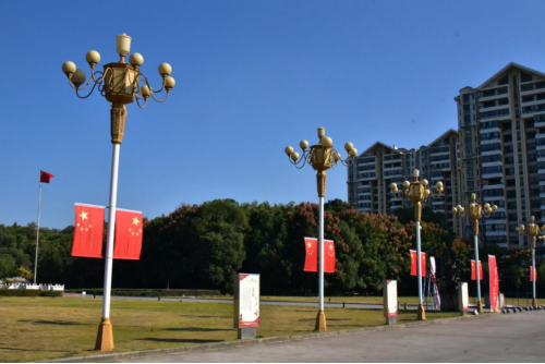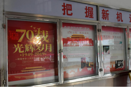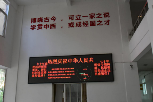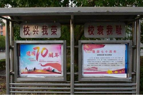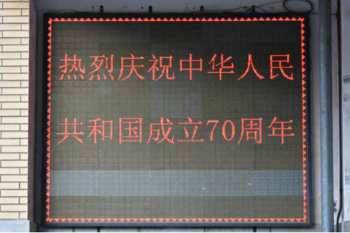 壮丽70年,奋斗新时代。为热烈庆祝新中国成立70周年,激发广大师生的爱国意识,进一步弘扬爱国精神,在国庆节来临之际,象征祥和、喜庆的一组组景观花坛,鲜活地展示在学校校门前;学校各主干道路都悬挂了鲜艳的五星红旗;庆祝新中国成立70周年的宣传标语,在学校各教学楼内LED屏上滚动播出;各学院的宣传栏展示了新中国成立70周年以来的光辉历程和辉煌成就,积极营造了庆祝新中国成立70周年的浓厚氛围。