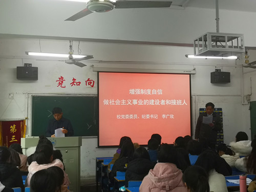 为深入学习贯彻党的十九届四中全会精神,推进党的创新理论“进教材、进课堂、进头脑”,12月24日上午,校纪委书记李广欣在浔东校区思贤楼209为其联系班级护A1811/A1812的同学讲授题为《增强制度自信做社会主义事业的建设者和接班人》的思政课,护理学院党政班子成员及联系班级班主任、党支部书记一同听课。