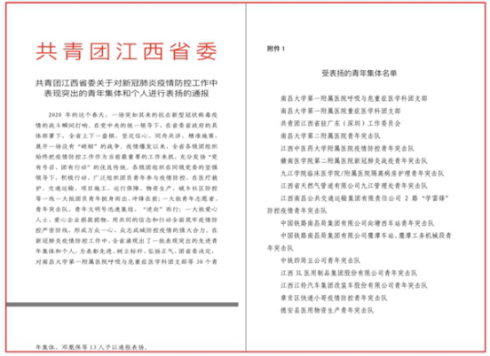 因在新冠肺炎疫情防控工作中表现突出,近日,共青团江西省委对九江学院临床医学院/附属医院“隔离病房护理青年突击队”给予了通报表扬。