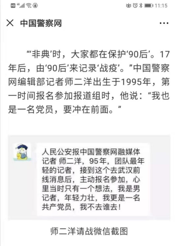 当新冠肺炎疫情出现时,他通过每日新闻报道和与媒体同行的交流,知道武汉疫情已经进入紧急状态。1月30日,单位下发征集工作人员赴武汉一线支援的通知,他立刻主动请缨,提交申请,要求奔赴前线。问他当时为什么有如此大的决心,他说:“当时心里只有一个想法,我是男记者,年轻力壮,我更是一名共产党员,我不去谁去!”之后,当他跟家里人说了他的决定时,爸妈表示尊重他的选择,有了家人亲情做后盾,他说自己心中充满了斗志和动力。经中国警察网报道,单位支援武汉的队伍中,师二洋是最年轻的记者。