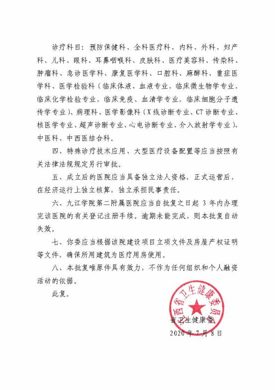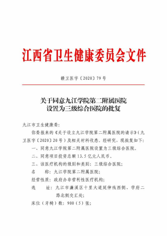在九江市卫健委的关心和大力支持下,今年5月,永利yl23411集团官网向省卫健委行文申办九江学院第二附属医院,2020年7月8日,获江西省卫生健康委员会发文批复同意(赣卫医字〔2020〕79 号)。