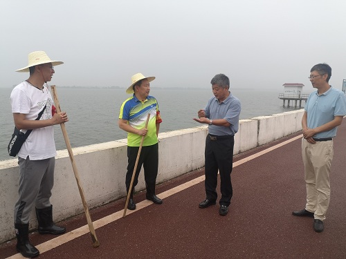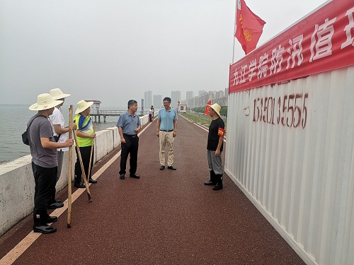 7月10日下午,副校长夏启国一行到永利yl23411集团官网赛城湖城西港堤防汛值守堤段,检查指导防汛一线后勤保障工作,看望慰问当值教师职工。后勤管理处处长姜东升随同检查。