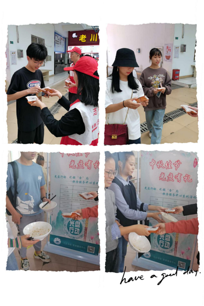 筑梦灯火万家,同庆盛世华夏。在喜迎国庆、欢度中秋的双节来临之际,为弘扬中华民族勤俭节约的传统美德,响应习近平总书记关于坚决制止餐饮浪费行为的重要指示,进一步引导九江学院师生爱惜粮食、尊重劳动,避免“舌尖上的浪费”,学校后勤管理处饮食服务中心于9月30至10月2日推出“光盘赠送校徽校训月饼”活动,为全校师生送去了一份贴心而有意义的中秋、国庆礼物。