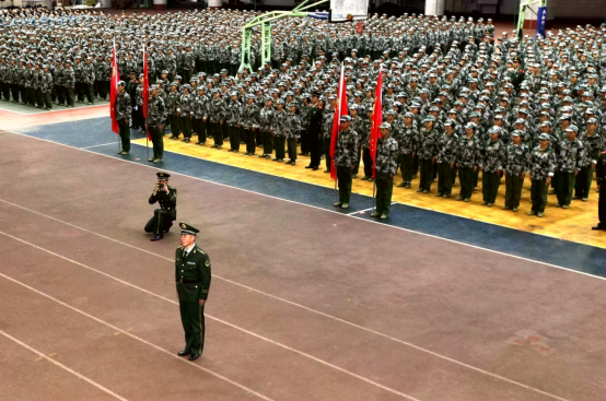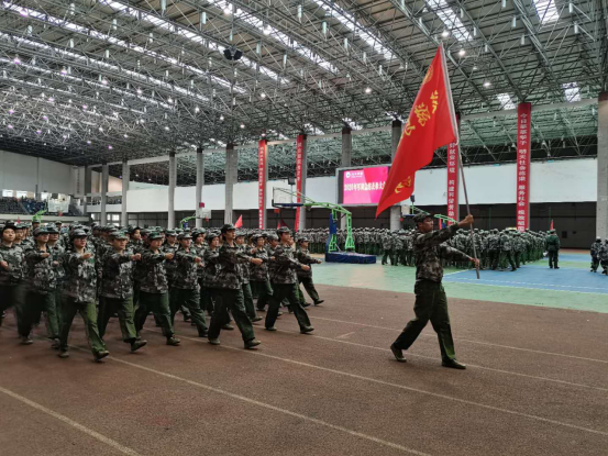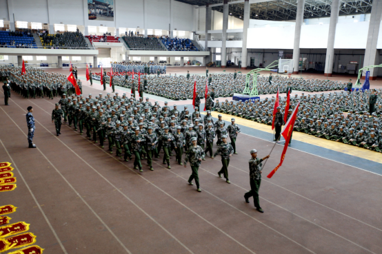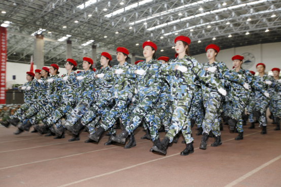 男标兵连和女标兵连代表2020级新生进行了汇报表演。他们整齐的队列、洋溢着青春朝气的面庞、规范标准的动作赢得了全场一阵又一阵的掌声与欢呼声。