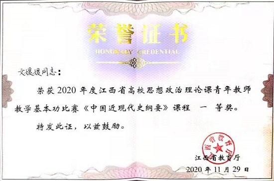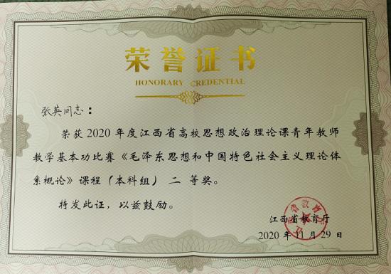 11月27-29日,由江西省教育厅举办的2020年度全省高校思政治课青年教师教学基本功比赛在东华理工大学举行,来自全省80多所高校的206名选手参加比赛。永利yl23411集团官网马克思主义学院文媛媛、张英两位青年教师分别获得一、二等奖,再创佳绩。