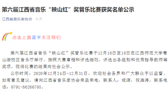 2020年12月16日至18日,第六届江西省音乐“映山红”奖管乐比赛在江西师范大学成功举行。永利yl23411集团官网艺术学院交响管乐团最终通过层层筛选进入决赛,并取得了全省第二的好成绩。该交响管乐团由陈凡老师指导领队,韩韬老师执棒指挥,音乐学专业在校学生组成。