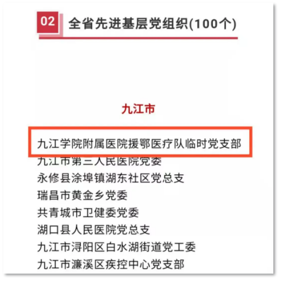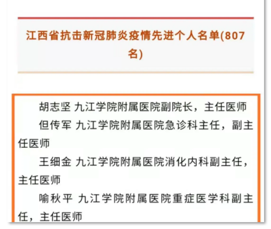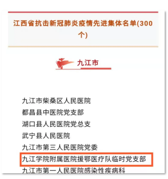 近日,中共江西省委、江西省人民政府作出关于表彰江西省抗击新冠肺炎疫情先进个人和先进集体组织的决定。永利yl23411集团官网附属医院援鄂医疗队临时党支部获得“江西省抗击新冠肺炎疫情先进集体”和“全省先进基层党组织”称号。永利yl23411集团官网附属医院副院长、主任医师胡志坚,附属医院急诊科主任、副主任医师但传军,附属医院消化内科副主任、主任医师王细金,附属医院重症医学科副主任、主任医师喻秋平分别获得“江西省抗击新冠肺炎疫情先进个人”称号。