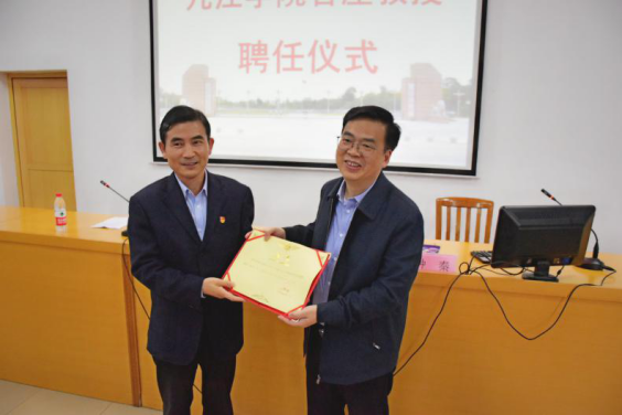 讲座开始前,在热烈的掌声中,魏立平为钟秦颁发九江学院客座教授聘书。