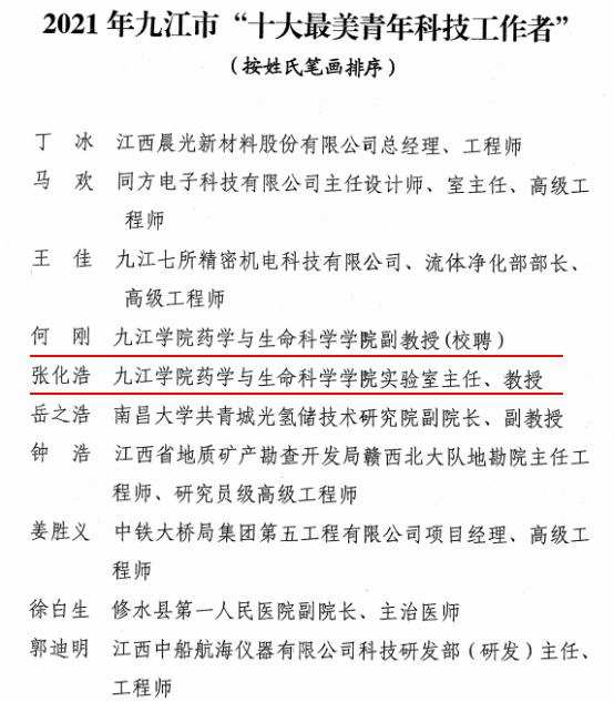 近日,中共九江市委人才工作领导小组办公室、九江市科学技术局、共青团九江市委、九江市科学技术协会联合下发了《关于选树2021年九江市“十大最美科技工作者”、“十大最美青年科技工作者”、“十大最美科普工作者”的决定》。永利yl23411集团官网教师谷翔、黄强、何刚、张化浩、柴竞艳获得九江市三个最美系列荣誉称号,其中黄强、谷翔荣评2021年九江市“十大最美科技工作者”,何刚、张化浩获评2021年九江市“十大最美青年科技工作者”,柴竞艳获评2021年九江市“十大最美科普工作者”。