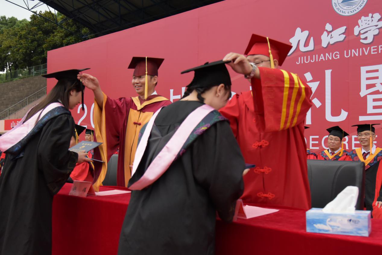 在学位授予仪式上,校党委书记赵伟、校长陈小林等校领导为毕业生代表颁发毕业证书,校学位评定委员会委员走到毕业生中间,为九院学子一一拨苏正冠,祝愿他们前程似锦、鹏程万里。