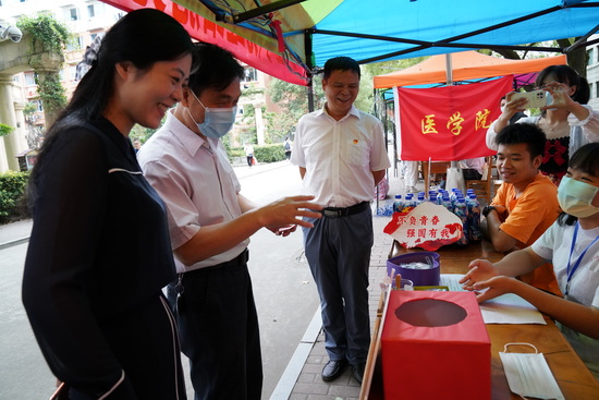 在医学院的新生报到区,许多班主任在悉心解答同学们的各种问题。医学院党委副书记刘频健老师告诉记者,“我们学院的许多班主任年纪都已经很大了,但是他们都自发来到新生报到现场主动跟学生交流、为同学们提供服务。他们对学生这种发自内心的关心、爱护让人十分感动。”