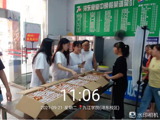 9月18日的教工食堂和9月21日的学生食堂,人头攒动,格外热闹,不少师生很快吃光了盘中餐,在餐具回收点,他们手拿“光盘”换得一块月饼,月饼是九江学院专属的“校徽”月饼。每一块都印着九院校徽,有蛋黄莲蓉、五仁、豆沙等口味,温情满满。师生们换得“校徽”月饼后,惊喜不已,迫不及待地拍照、发朋友圈。他们说,月饼很精美,很有纪念价值,都舍不得吃了。