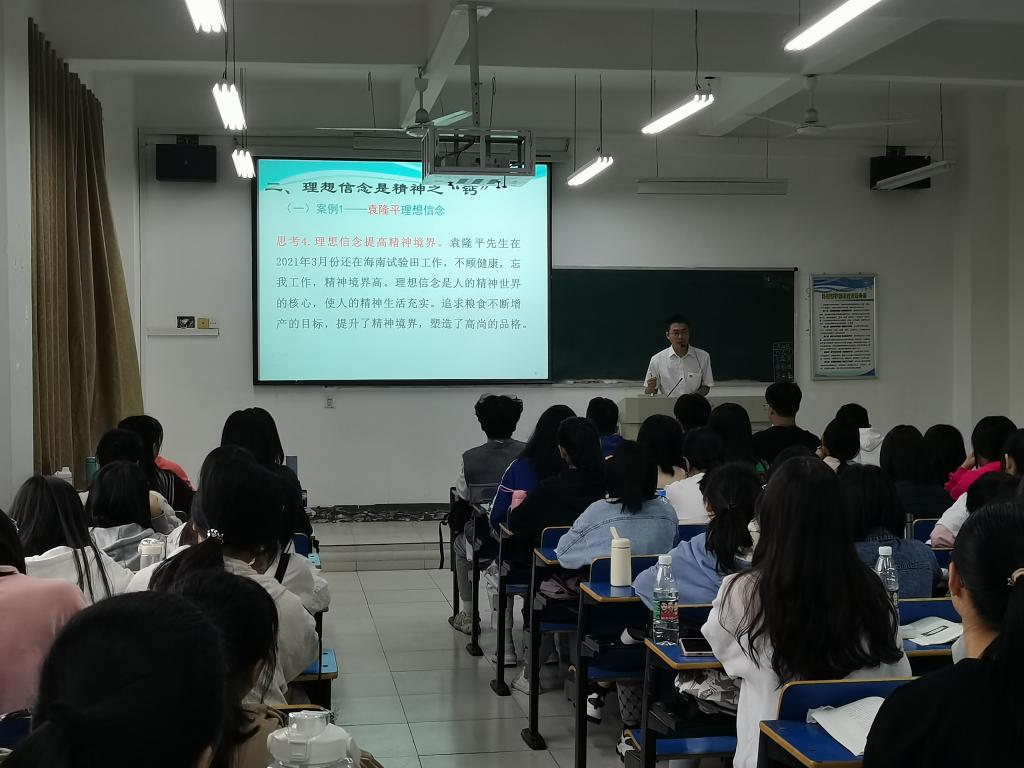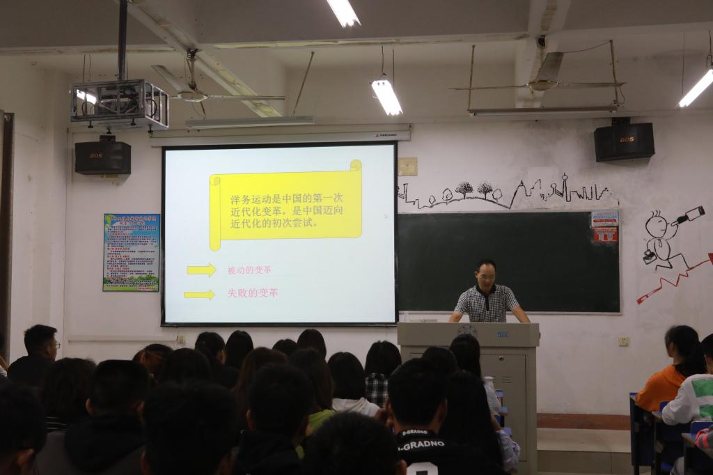 在谢伏华博士主讲的《毛泽东思想和中国特色社会主义理论体系概论》课程中,以学生为主讲的“我来讲新闻”环节作为当天课程内容的开场,教师点评后引入授课主题,重点讲述了社会主义建设道路初步探索的重要理论成果,着重分析了新中国成立初期社会主义建设的历史背景、党对“走自己的道路”的探索历程与重要成果等等内容;在课程《思想道德与法治》中,余志权老师以正反两个案例导入,重点讲述了理想信念是精神之“钙”,引导同学们要坚定理想信念,做有担当、敢作为、有能力的新时代青年;在《中国近现代史纲要》课堂中,姚建平副教授讲授了洋务运动的兴衰,分析了洋务运动的兴起背景、指导思想和主要内容,引导学生正确地认识了洋务运动的客观作用和失败的历史教训;罗小青老师则讲授了戊戌维新运动的意义和失败原因、教训,通过引导学生对形象生动的历史素材的感知,使同学们客观辩证地了解国史、国情,认识社会,树立了正确的人生观和价值观。