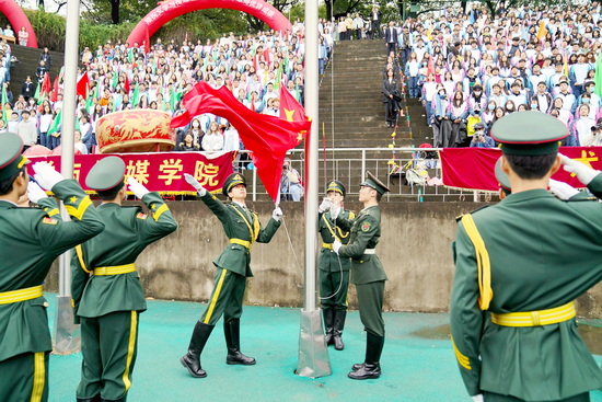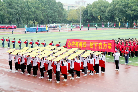 入场式结束后,国旗班的同学们迈着矫健整齐的步伐走向升旗台,在庄严的国歌声中,在全体师生的注目礼下,五星红旗冉冉升起,飘扬在学校的上空。