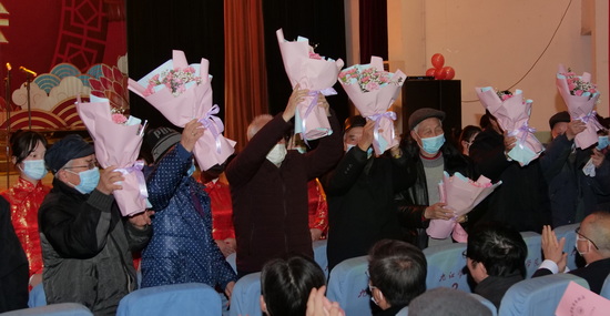 现场给部分离退休老同志献花,表达敬意