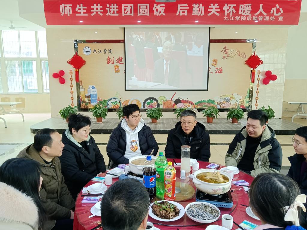 后勤管理处、生命科学学院、护理学院、学生处,电信学院负责人和四位同学一起参加了午宴。席间,后勤管理处负责人祝愿留校学生在新的一年里学习进步,身体健康,家庭幸福,并提醒他们春节期间多与父母联系,问候家人,在校利用假期好好学习,加强锻炼。参加午宴的各位老师一起给留校学生发放了节日红包和后勤处精心准备的新春大礼包。当一盘盘可口美味的菜肴上桌,大家互祝新年快乐,师生谈笑不断,其乐融融,共度了一个温暖祥和的大年三十。