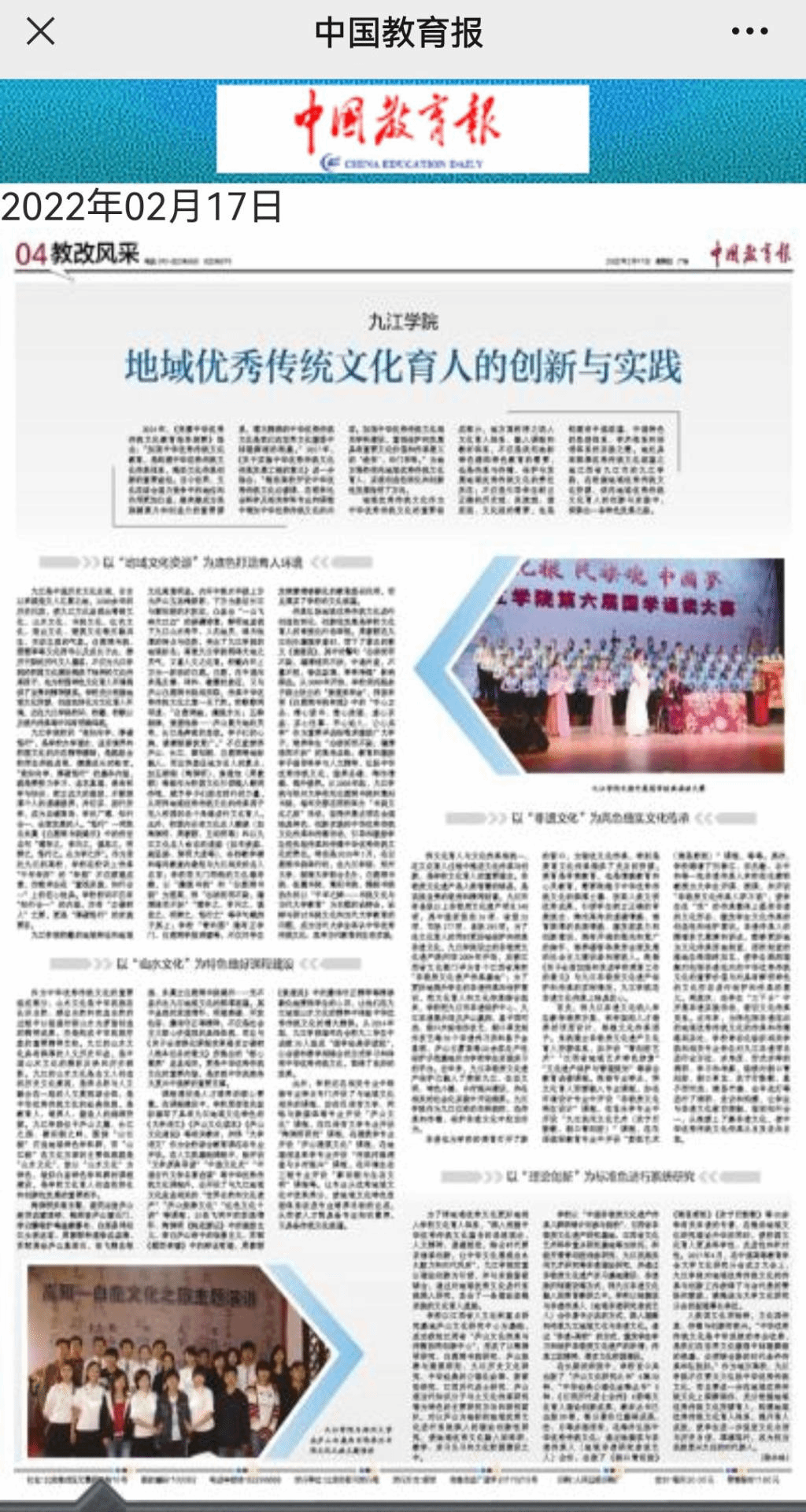 为了将地域优秀文化更好地纳入学校文化育人体系,“深入挖掘中华优秀传统文化蕴含的思想观念、人文精神、道德规范,结合时代要求继承创新,让中华文化展现出永久魅力和时代风采”,九江学院注重以理论创新为引领,并与实践紧密结合,通过对地域优秀文化进行系统深入研究,走出了一条理论助推实践的文化育人道路。