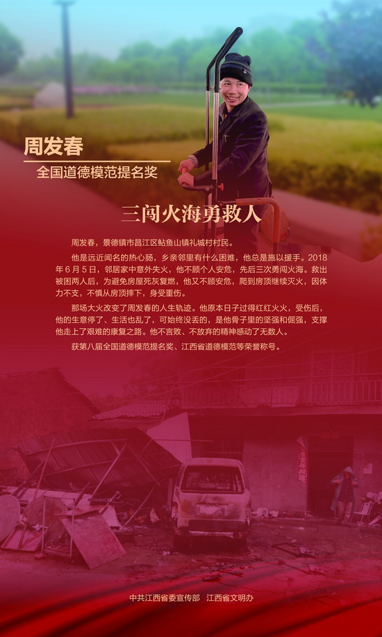 在景德镇昌江区鲇鱼山镇礼城村,有一位叫周发春的平凡英雄。说他平凡,确实如此,今年45岁的他只是村里一名普普通通的农民,吃着家常便饭,过着平静的生活;偶尔坐在轮椅上与邻居聊天,或是起身慢步行走;但他又是一位救火英雄,村上的人每提到他都会竖起大拇指交口称赞。