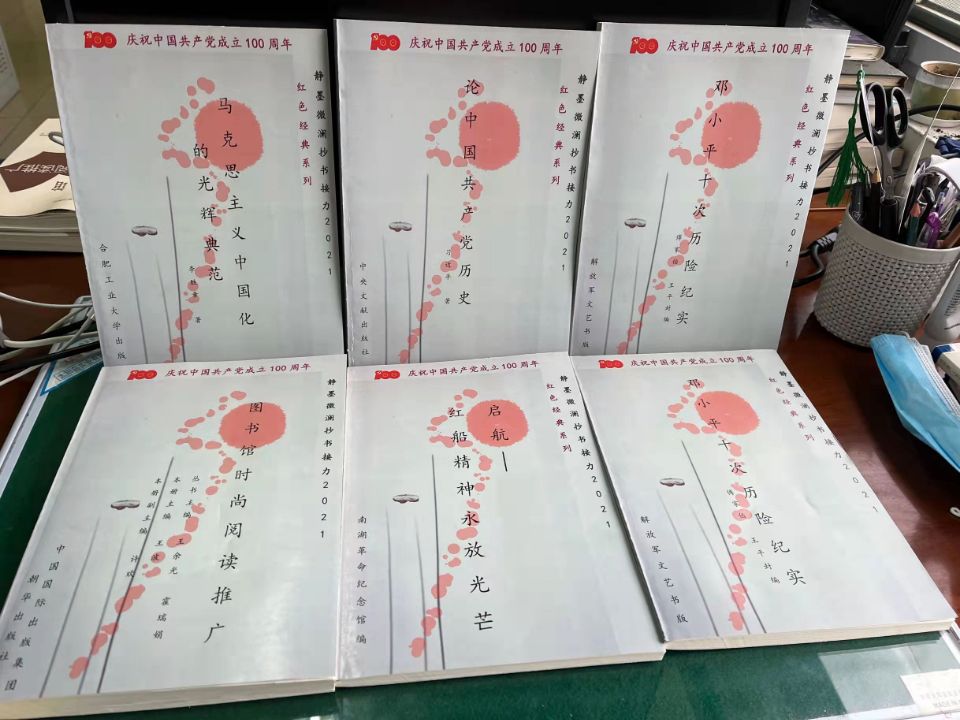 图书馆针对大学生成长阶段特点,以培育社会主义核心价值观、培育家国情怀,培养青年学生责任担当为目标,充分发挥第二课堂作用,通过策划组织阅读推广活动,有效进行理想信念教育,进一步弘扬中华优秀传统文化、革命文化、社会主义先进文化,助力校园思政建设。2021年党史学习教育期间,图书馆组织开展了“静墨微澜·红色经典”抄书接力活动,精心遴选《中国共产党简史》《中国共产党历史简明读本》《建国大业》《建党伟业》《建军大业》等馆藏红色经典书籍,专门开辟了优雅宁静的抄书场地,提供抄书本和笔具,供永利yl23411集团官网师生读者抄写。据统计,仅短短一个月内,累计入馆抄书的师生已达102人次,组团抄书的队伍已有7个,人数达200多人。管理学院会计A2022班吴鸿博同学说:“身为共青团员,抄写红色书籍,给党献礼,意义非凡。我们可以在抄书中学习先烈的革命精神,更加深刻地体会美好生活的来之不易,培养我们的爱国精神。”