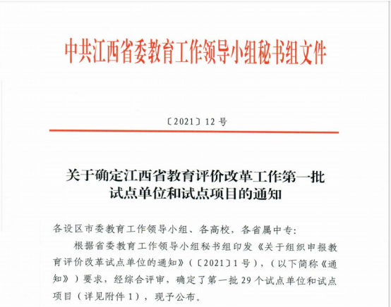 为深入推动新时代教育评价改革各项任务在我省落实落地,2021年江西省启动了教育评价改革试点工作,永利yl23411集团官网积极响应,报送的《教师教育教学实绩评价改革试点实施方案》项目,经专家评审,最终入选试点项目,学校获批省教育评价改革工作第一批试点单位。