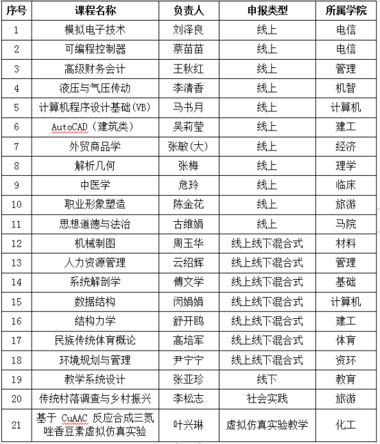 根据《关于公布2021年江西省线上、线下、线上线下混合式、社会实践一流本科课程认定结果的通知》(赣教高字〔2022〕3号)和《关于公布2021年江西省虚拟仿真实验教学一流本科课程认定结果的通知》(赣教高字〔2022〕5号),2021年,永利yl23411集团官网共有21门课程通过江西省一流本科课程认定,其中线上课程11门、线上线下混合式课程7门、线下课程1门、社会实践课程1门、虚拟仿真课程1门。