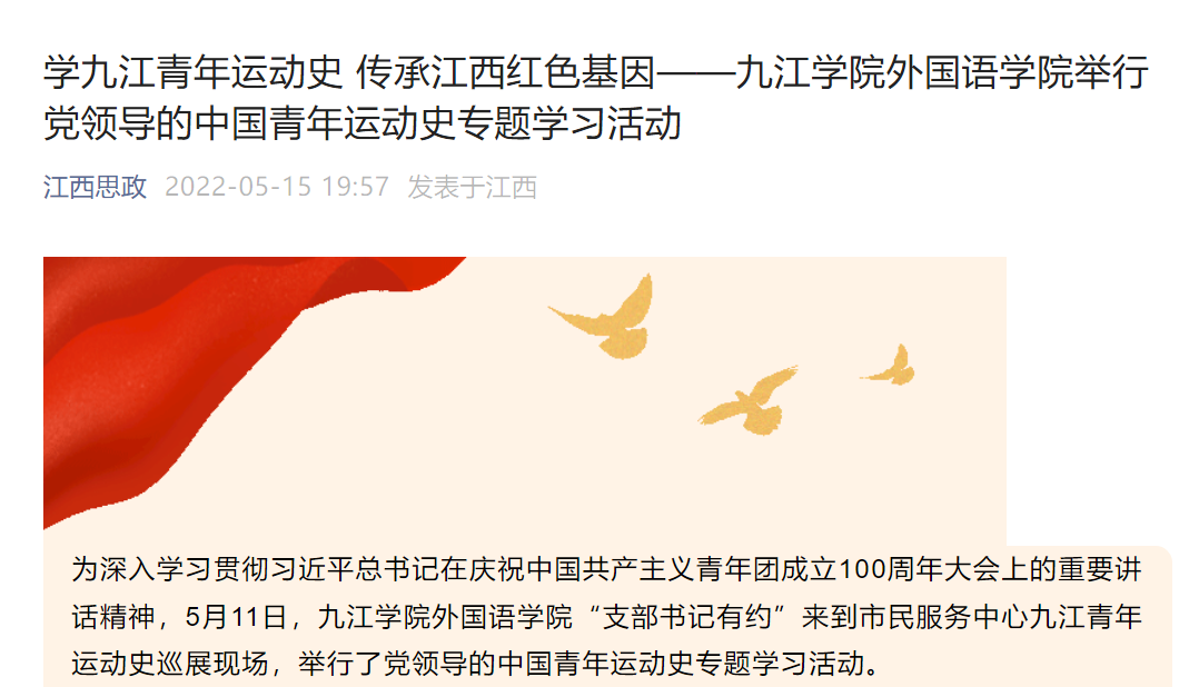 五四青年节前后,人民日报、新华社、学习强国、江西网、江西日报、江西思政、江西学习平台等媒体以《九江学院青春思政课:这就是青年力量》《九江学院护理学院开展“青春向党,建功新时代”五四青年节年系列文体活动》《九江学院召开2022年五四青年节师生座谈会》《九江学院开展“青春向党,建功新时代”五四青年节年系列文体活动》《有梦的青春会发光——第26届“中国青年五四奖章”获得者扫描》《中国五四青年奖章获得者谭翊泉:让青春之花开在乡村沃野》《九江学院药学与生命科学学院开展“在青春的赛道上奋力奔跑”青年节系列活动》为题,生动报道了永利yl23411集团官网强化思想政治工作,教育引导广大青年学子牢记党的教导,弘扬“五四”精神,立志民族复兴,以昂扬的斗志和精神状态迎接党的二十大胜利召开等情况,累计稿件篇幅10篇以上。