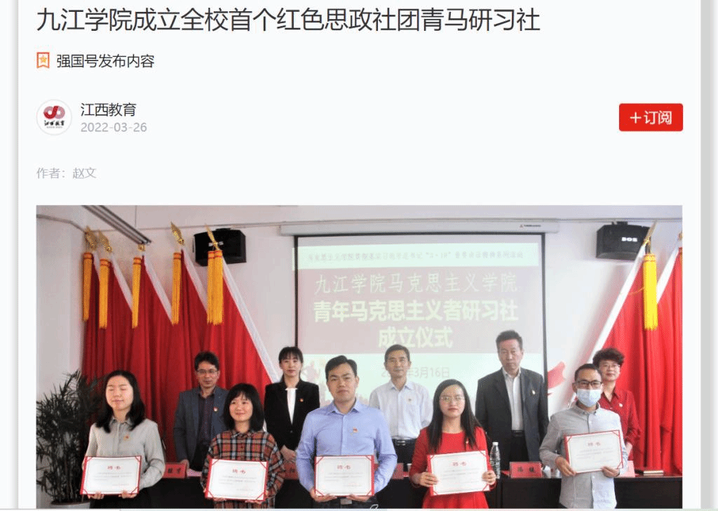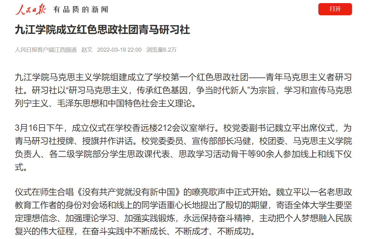 上半年以来,人民日报、新华社、新华网、学习强国、中国教育新闻网、江西思政、掌中九江等媒体以《九江学院成立红色思政社团青马研习社》《九江学院:“声”入人心,凝聚奋进力量》《九江学院|党史学习教育再出发》《让思想政治教育“活”起来》为题,深入报道永利yl23411集团官网深入推进党史学习教育,建立常态化、长效化制度机制,不断巩固拓展党史学习教育成果的做法。综合浏览量达10万次以上。