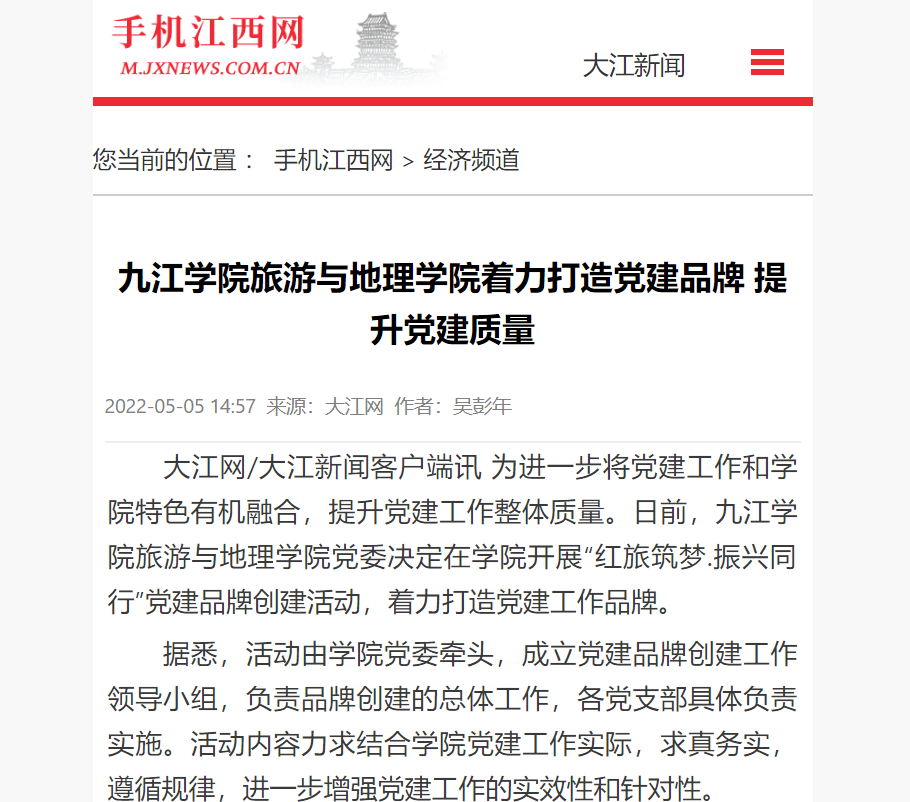学习强国、江西日报、大江网、江西教育、江西思政等媒体以《党建领航 思政铸魂 立德树人》《九江学院旅游与地理学院着力打造党建品牌提升党建质量》《九江学院:人人争当“红工匠”,“党建+学工”促学生全面成长》《九江学院机械与智能制造学院:构建人人争当红工匠“党建+学工”育人模式,促进学生全面成长》等为题,重点报道了永利yl23411集团官网加强基层党组织建设,抓好学生红色教育、构建人人争当红工匠“党建+学工”培养模式,争创思政工作特色品牌,促进学生全面成长等方面的经验做法。