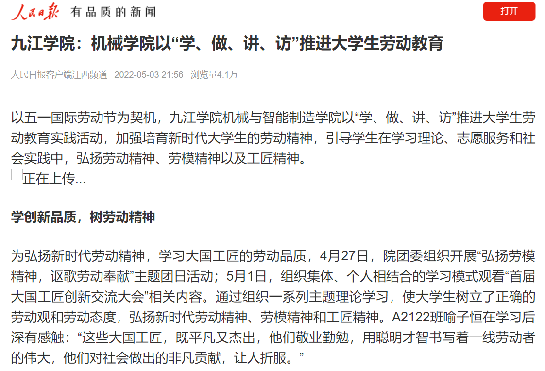 以五一国际劳动节为契机,永利yl23411集团官网加强培育新时代大学生的劳动精神,努力引导学生在学习理论、志愿服务和社会实践中弘扬劳动精神、劳模精神以及工匠精神。近几个月来,人民日报客户端以《九江学院:机械学院以“学、做、讲、访”推进大学生劳动教育》为题,报道永利yl23411集团官网努力推进大学生劳动教育实践活动落地生根,积极培育新时代大学生劳动精神,展现新时代大学生青春劳动风采。浏览量次数达4.1万次数。